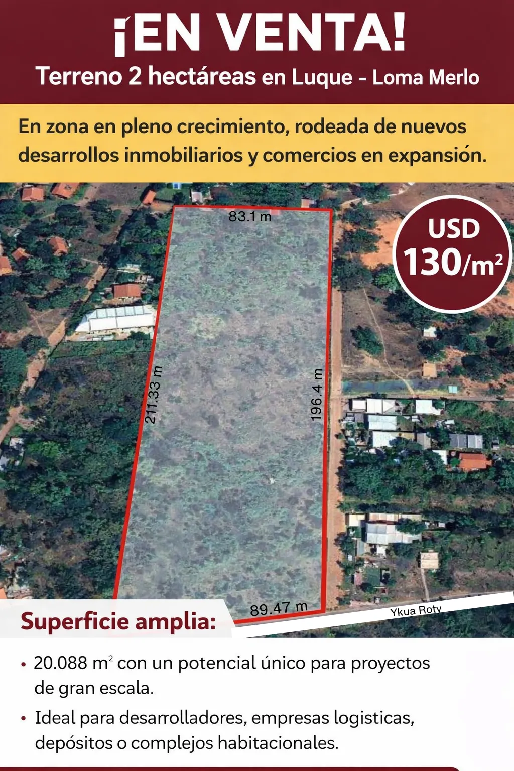 En Venta terreno de 2 hectáreas en Luque Loma Merlo En una zona en pleno crecimiento, rodeada de nuevos desarrollos inmobiliarios y comercios en expansión. Superficie amplia: 20.088 m² con un potencial único para proyectos de gran escala. Ideal para desarrolladores, empresas logísticas, depósitos o complejos habitacionales. Precio por metro cuadrado: USD 130/m2