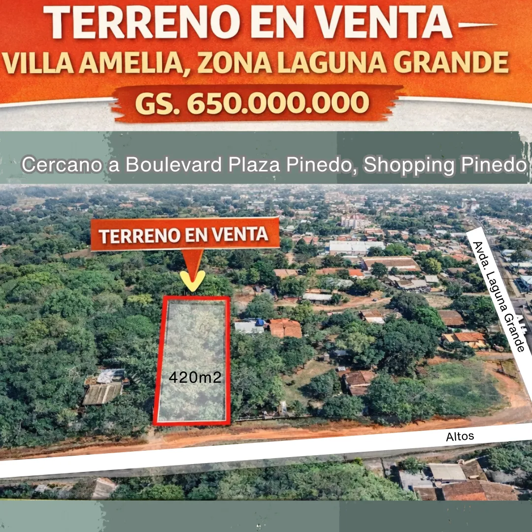 Terreno en venta – Villa Amelia, Zona Laguna Grande ¡Ubicación estratégica que lo hace ideal para tu próximo proyecto! Este terreno de 420 m² 11.50m x 36.62 se encuentra en Barrio Villa Amelia, una zona con crecimiento urbano constante y excelente conectividad dentro de San Lorenzo. Estás a minutos de servicios, comercios, accesos principales y puntos clave de la ciudad, lo que lo transforma en una oportunidad ideal tanto para vivienda como inversión. ✅ Por qué esta ubicación es una ventaja: * Zona residencial tranquila y en desarrollo. * Cercanía a Shopping Pinedo y comercios locales. * Acceso rápido a avenidas principales y transporte