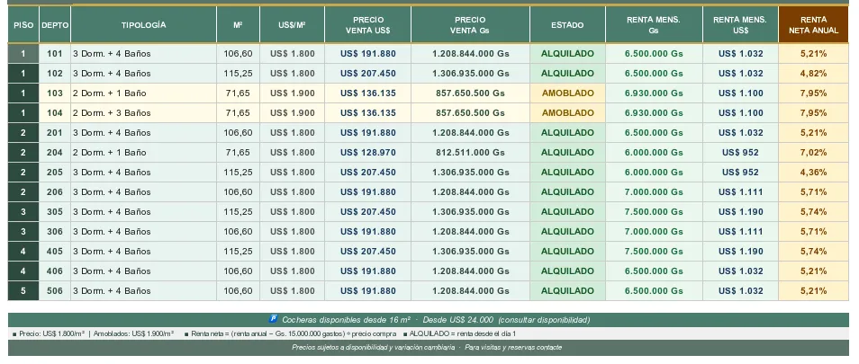 DETALLES: - Departamentos de 71 – 100 m2 propios. - 2 dormitorios amplios - (amoblado y sin muebles). - 3 baños. - Área social c/ amplia sala y balcón c/ parrilla. - Cocina totalmente amoblada (mudanza inmediata). - Área de servicio AMENITIES: - cochera. - piscina en terraza. - quincho equipado. - Gimnasio. - portero y seguridad 24/7. Precio: DESDE U$ 140.000.- (Renta activa entre 5.7 y 7.5 % anual). Disponibilidad inmediata. Consultas al+595 981 468883.-