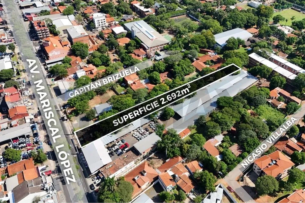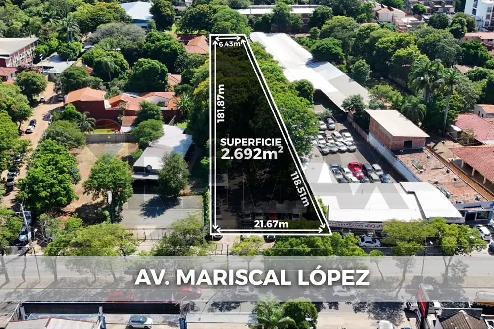 VENDO TERRENO DE 2.692 M² SOBRE MCAL. LÓPEZ Importante terreno ubicado sobre la Avda. Mcal. Lopez a la altura de Villa Olimpia especial para inversión, cercano a farmacias, estaciones de servicios, colegios, supermercados, negocios, empresas concesionarias, universidades. Superficie total: 2.692 mts² Dimensiones: -Frente: 21.50 mts -Fondo (lateral derecho): 181.87mts -Fondo (lateral izquierdo): 118.51 mts -Contrafrente de 63 mts Documentaciones en regla, listo para transferir y apto para crédito bancario.